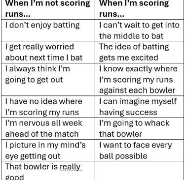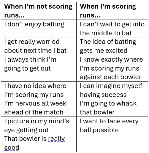 Now, on the other side of the page, write down all of the things you do and think when you’re scoring runs and batting well.