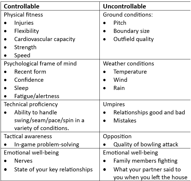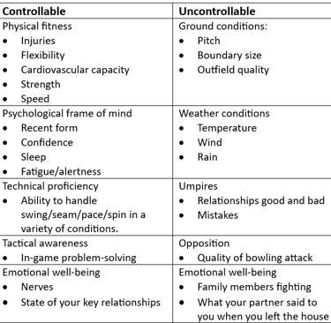 When you’re building your weekly routine and training plan, ensure that you allocate time to each of the key controllables e.g. going through your daily stretching routine to ensure you feel fresh on game day or build a plan for where you’re going to score against each of the bowlers you’re due to face in your next match.