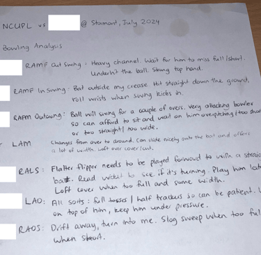 Knowing who we were due to play in the week ahead, I searched for a recent match of theirs on YouTube and studied their bowling attack. I focused on each bowler’s strengths and weaknesses and overlaid that with my own strengths and weaknesses and formulated a plan for how I wanted to play against them and which shots I wanted to score from.